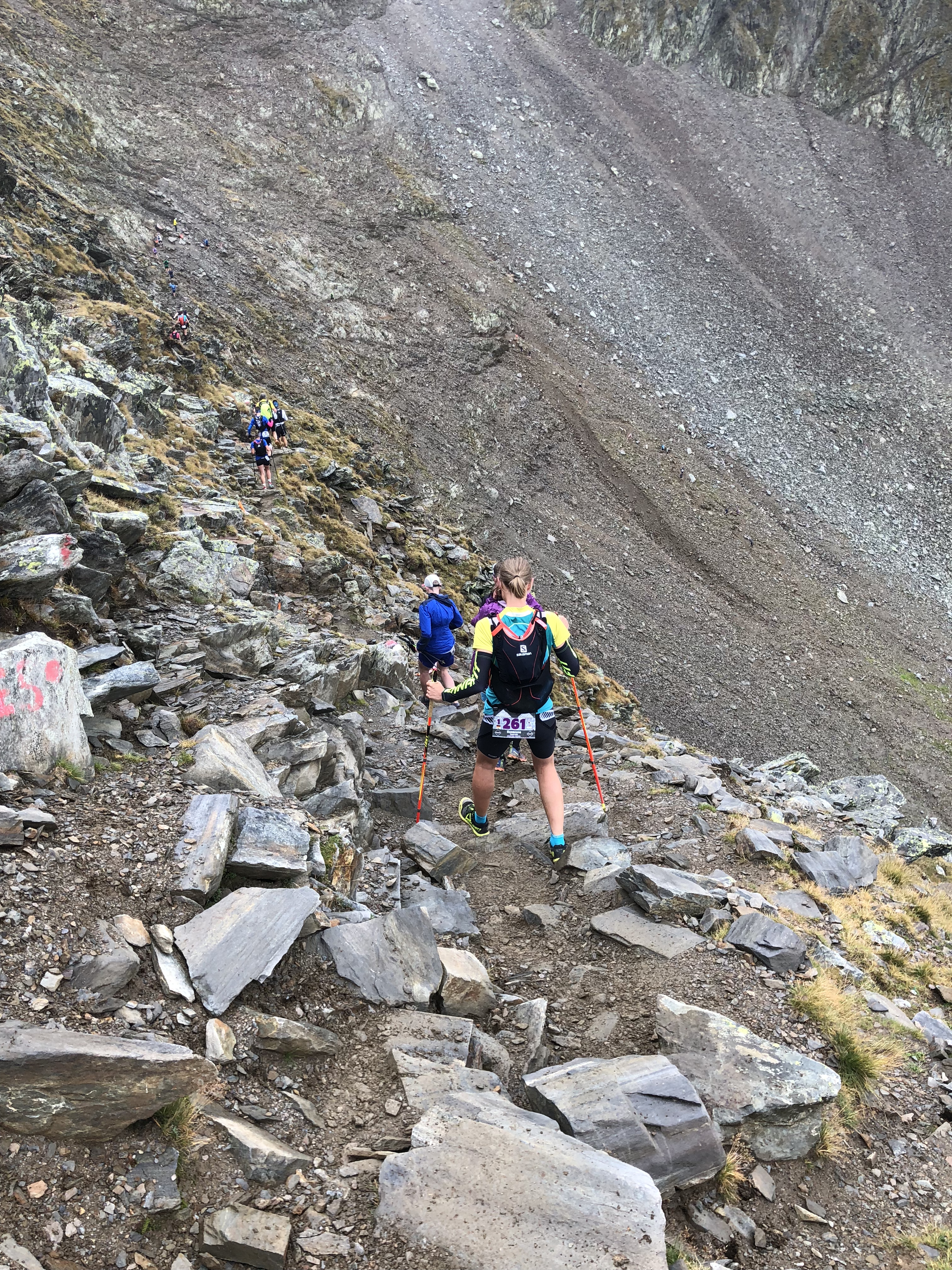 Was danach kam ließ unserer Trail Runner Herzen höher schlagen. Geniale Pfade führten uns in stetigem auf und ab ins Skigebiet Meran 2000. Susanne machte ein klasse Tempo, flog förmlich über die felsige Landschaft und wir konnten uns auf der kompletten Strecke weiter nach vorne laufen. Der letzte Teil des Abstiegs kam uns dann nicht so sehr entgegen, mußten doch 600 hm auf 4 km zurückgelegt werden auf teilweise rutschigen Wiesen. Aber auch das haben wir schlussendlich gemeistert und konnten uns beim Zieleinlauf über einen tollen 6 Platz freuen was wir mit unserem täglichen Zielsprung ausdrückten.