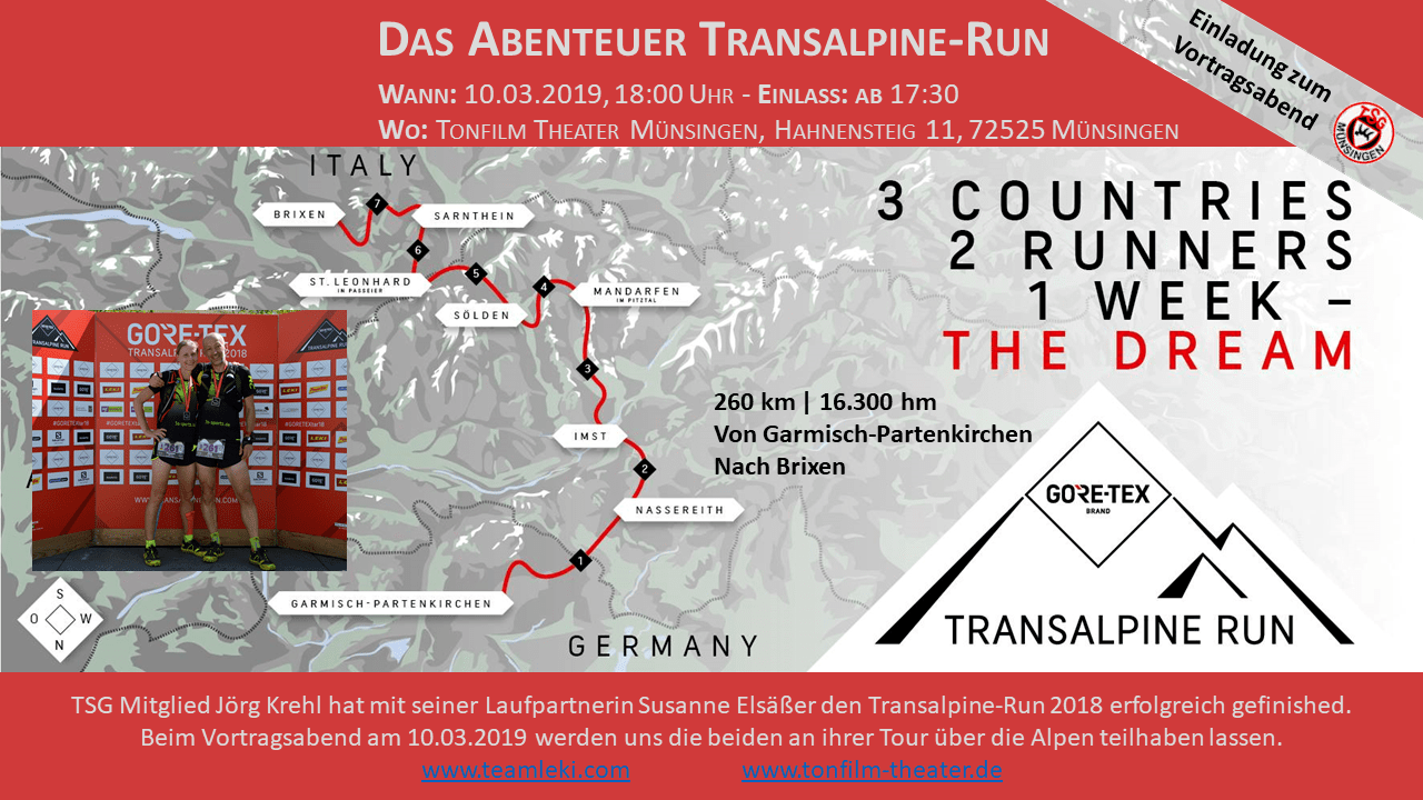 Am Sonntag 10.03.19 um 18 Uhr starten wir unseren Vortag mit Bildern, Videos und kurzweiligen Einblicken in die Zeit vor und während des Trans-Alpine-Run 2018