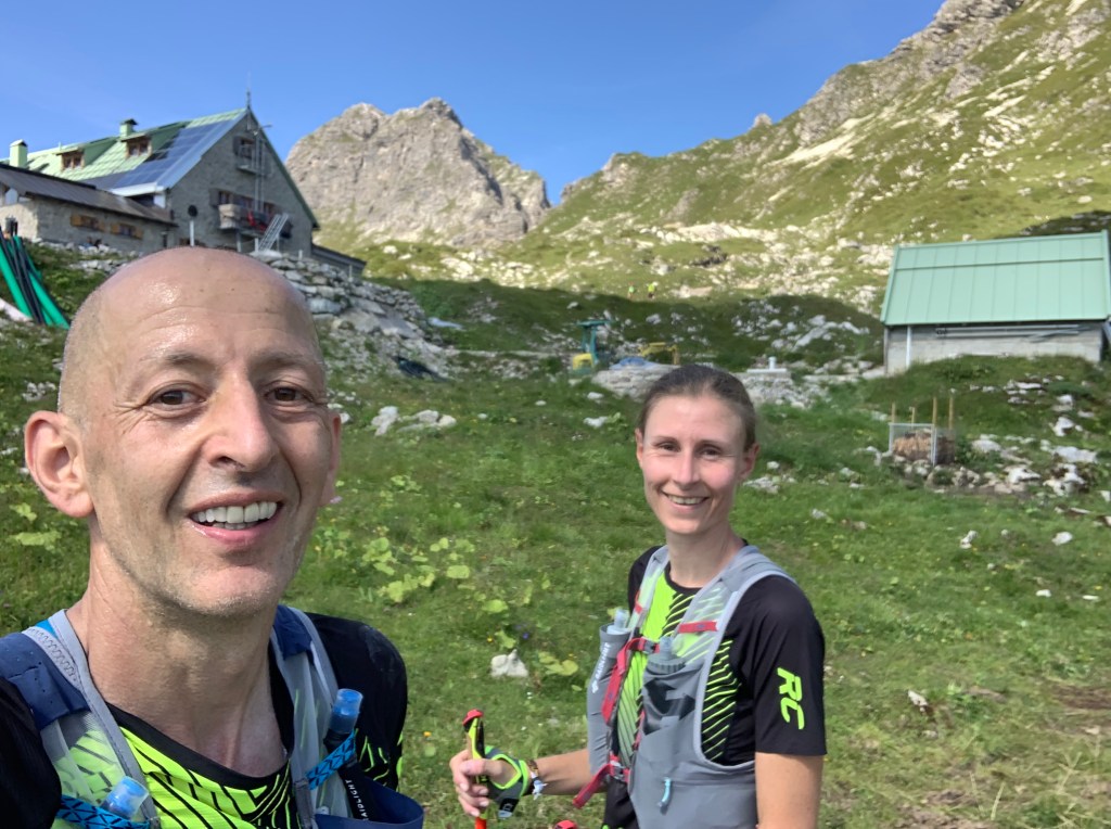 Vorbei an der Skiflugschanze und Freibergsee, noch im Wald und damit im Schatten, verließen wir die Waldtrails und bahnten uns in Serpentinen den Weg unter der Fellhornbahn nach oben. Die Sonne meinte es wirklich gut mit uns und der Schweiß floss in Strömen. VP1 bei km 12 und wir haben entsprechend auch sämtliche Wasservorräte gut aufgefüllt. Danach endlich schöne Trails, auf denen wir uns zur Roßgundscharte hoch arbeiteten. Mit Blick ins Nachbartal (und Rappenseehütte und so) genossen wir die flowigen Kilometer auf dem Krumbacher Höhenweg und dann war die Mindelheimer Hütte auch schon erreicht. Kein VP, aber ein Wasserschlauch, den viele nutzten. Die Terasse war schon gut von Wanderern gefüllt und gemeinerweise hatten die tatsächlich auch Kaiserschmarrn auf dem Teller. Dann folgte der Downhill ins Tal, mitunter etwas grumpelig, aber bergab ist ja (fast) immer gut. Der Anstieg zum Schrofenpass lag noch im Schatten, aber die Beine wollten erst wieder auf bergauf umgepolt werden. Jörg meinte noch „ich mach mal bissle langsamer“ – und keine 2 Minuten später wandelte sich das in die Aussage „mein Magen rebelliert, nix geht, ich brauche einen Busch. Sofort“. Sofort war etwas blöd. Genau auf diesem Kilometer rechter Hand steiler Fels, links steiler Abhang nach unten. Blöd. Besagter Kilometer später war dann ein Abzweig und eine repräsentative Auswahl an Latschenkiefern erreicht. Kurze Pause. Rückmeldung „etwas Besserung“. Diese Besserung hielt leider nur 100 m, nach welchen Jörg sich mal setzen musste, der Kreislaufteufel hat ihm schlicht den Stecker gezogen. Froh war ich, dass wirklich viele Mitläufer um uns gleich Hilfe anboten und auch beim Auffangen als es dann die Füße unter dem Boden weggezogen hat mit aufgefangen haben. Puh. Erstmal Pause, gucken, was hilft… Gel, Wasser oder halt einfach nur im Gras liegen und Pause. Die hat es gebraucht. Sukzessive hat Jörg seine Farbe im Gesicht von kreidebleich zu nur leicht bleich zurückerlangt und nach einer 3/4 Stunde setzten wir unsere Etappe dann fort. Zwar ging es ihm nicht gut und die ein oder andere Pause und vorsichtige Wandereinlagen hat es gebraucht, aber der Hund hat sich da durchgequält. Es waren aber weite 7 km bis zur VP2. Diese haben wir dann für eine ausgiebige Pause genutzt und auch Jörg ging es langsam wieder besser. Die letzten km bis Lech hatten zwar auch noch einige hm parat, aber doch auch endlich Downhillkilometer, die allesamt gut laufbar waren.
