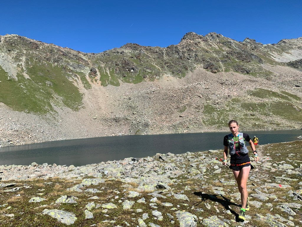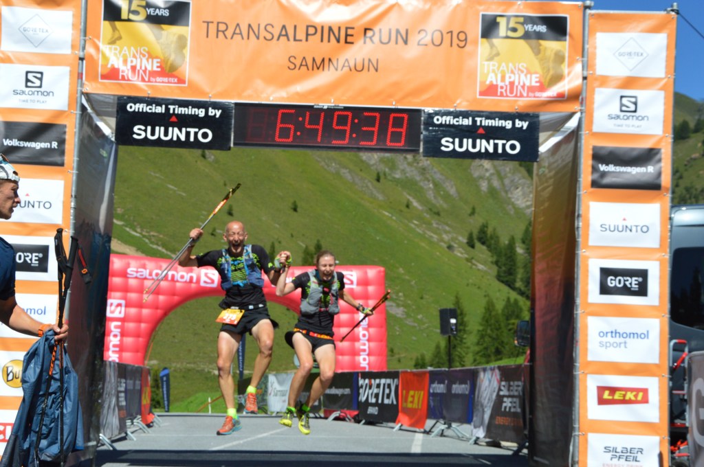 Nach einem wirklich wunderschönen Downhill hinab in Skigebiet von Serfaus bis zur Kölner Hütte konnten wir die Beine wieder locker laufen, was auch nötig war. Denn hier erwartete uns der nächste Anstieg, eine weitere rote Skipiste hoch. Danach ging es geradeaus in Susanne’s Spezialität – nasse, tiefe, schlammige Trails und das auch noch leicht ansteigend. Ab hier fühlte sich die Trail Prinzessin so wohl, das sie immer abwechselnd über ihre schönen neuen gelben Schuhe und den Matsch, den diese anscheinend nicht vertragen, zu fluchen begann. Aber es half alles nichts, der Weg mußte absolviert werden und die Flüche ebbten bis zum Ende dieses Abschnitts nicht ab. Irgendwann spuckte uns der Schlamm wieder auf einen steinigen Trail aus und wir zogen an immer mehr Teams vorbei Richtung 2. VP am Arrezjoch. Vorbei an der Hexenseehütte nahmen wir den letzten Anstieg zur Ochsenkopfscharte in Angriff. Thema Angriff: Die Schlammprinzessin schaltete einen weiteren Gang hoch und wir überholten weiter bis zum Joch. Über schöne nasse Wiesentrails ging es von hier ab nur noch nach unten, die Wiesen wandelten sich in einen Schotterweg welcher uns bis nach Ravaisch führte. Von hier nochmals leicht wellig hoch bis zur Zielankunft in Samnaun. Viel früher als erwartet mußte Sandra wieder im Zielbereich bereitstehen um uns in Empfang zu nehmen. Mit den Worten „Wie krass seid ihr denn drauf“ empfing Sie uns und wir freuten uns richtig über unsere beste TAR Platzierung ever. 6:49 bedeuteten Platz 4 in unserer Klasse – wir sind begeistert.