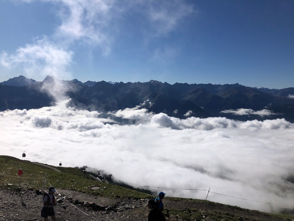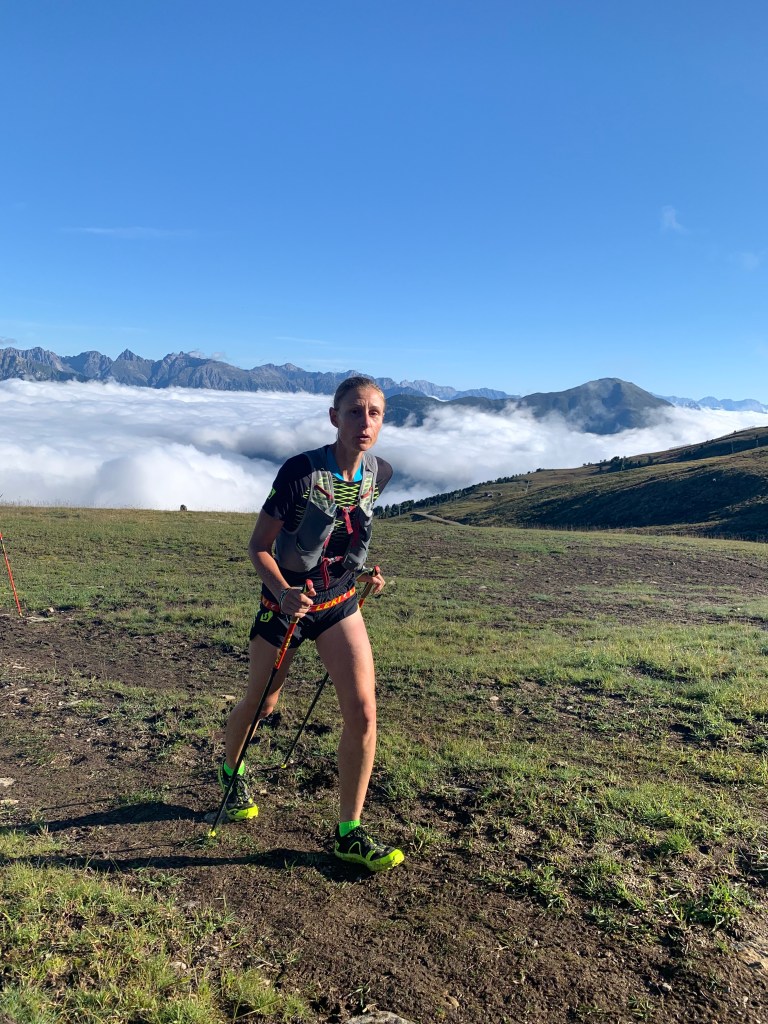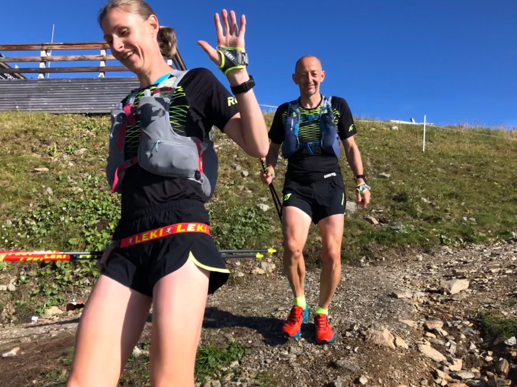 Team Leki hatte schon ordentlich Respekt, und wir wollten die Etappe nicht zu offensiv angehen. Auch bei uns fühlten sich die Beine etwas zäh und schwer an und so mußten wir nicht extra das Gas raus nehmen. Zum Einrollen führte uns der Streckenchef 4 km das Tal entlang bevor es dann in den langen Anstieg über das Urgtal 1650 hm auf das Fisser Joch ging. Susannes Hoffnung ging in Erfüllung und uns erwartete strahlender Sonnenschein als wir den Nebel verließen. Als Susanne’s Diesel dann warm gelaufen war ging es immer besser und zügiger die steile Skipiste hoch wo uns zur Freude bereits Sandra erwartete um herrliche Bilder zu schießen. Hier war auch die erste Verpflegung, wo Susanne inzwischen regelmäßig den süßen Powershot in Salz tunkt. Ob das wohl lecker ist ? Egal – es hilft!