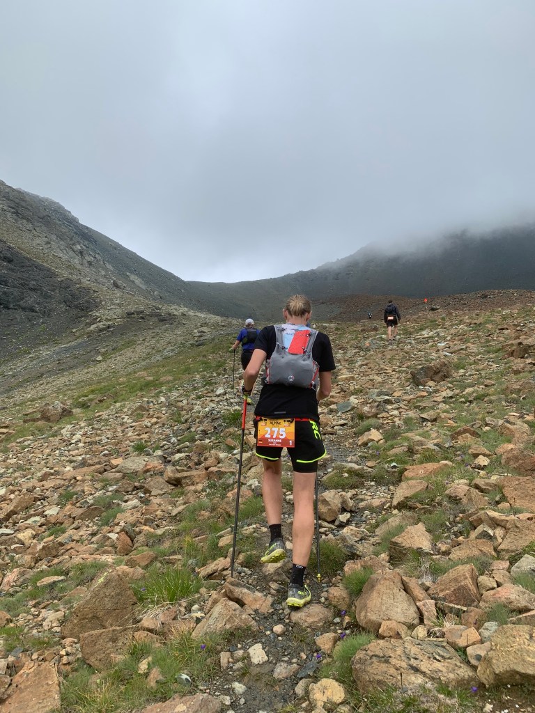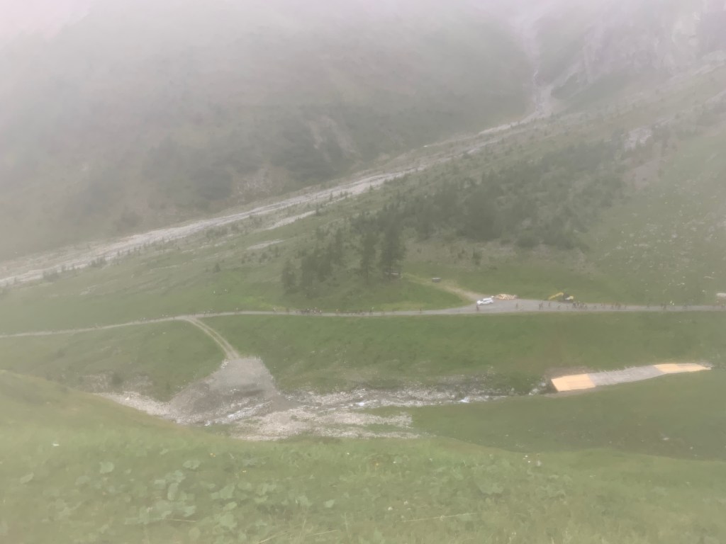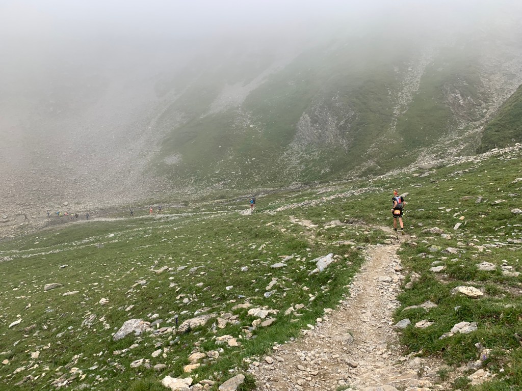 Nachdem Susanne an der 1. VP am Zeblasjoch auf 2539 mtr. wie gehabt süßen Shot in Salz getunkt gegessen hat machten wir uns auf zum höchsten Punkt des Tages, die Fuorcia Val Gronda auf 2752 mtr. Die Aussicht hat sich hier in Grenzen gehalten, es war neblig und etwas kalt. Nach unserem Downhill über den Fimbernpass hinab nach Griosch kam uns die Wärme vom Tal entgegen genau so wie die 2. Verpflegungsstelle.