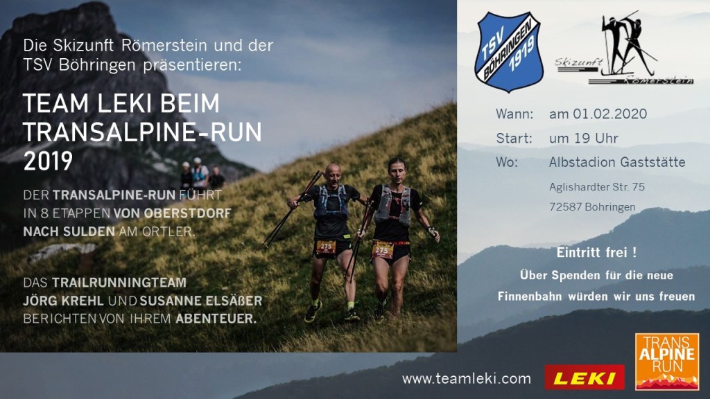 Keine Sorge, Team Leki war nicht auf Abwegen und hat sich schon gar nicht auf Langlauf Skiern mit den Assen der Skizunft Römerstein gemessen…. dennoch war es der „skibedingte“ Kontakt von Jörg zu Matthias Etzel, der seinerseits der Trailszene nicht abgeneigt ist und ebenso dem Ausdauersport fröhnt. Eher zufällig kam zur Diskussion, dass der TSV Böhringen finanzielle Unterstützung zur Errichtung einer Finnenbahn benötigt und kurzum hatten die beiden die Idee geboren, einen Trailrun-Vortrag über den Transalpine-Run 2019 auszurichten und Einnahmen an diesem Abend auf Spendenbasis in eben jene Finnenbahn zu investieren.
