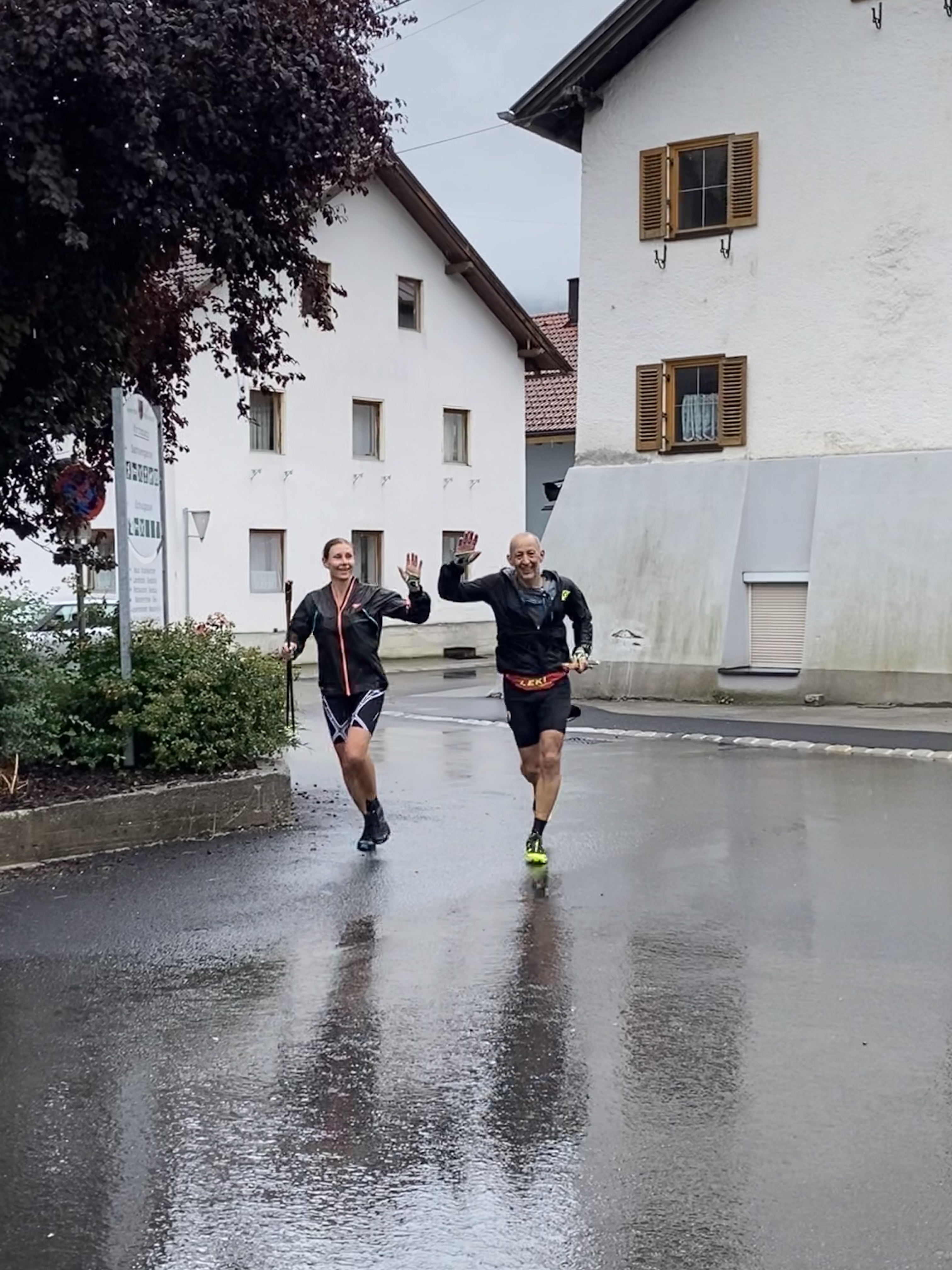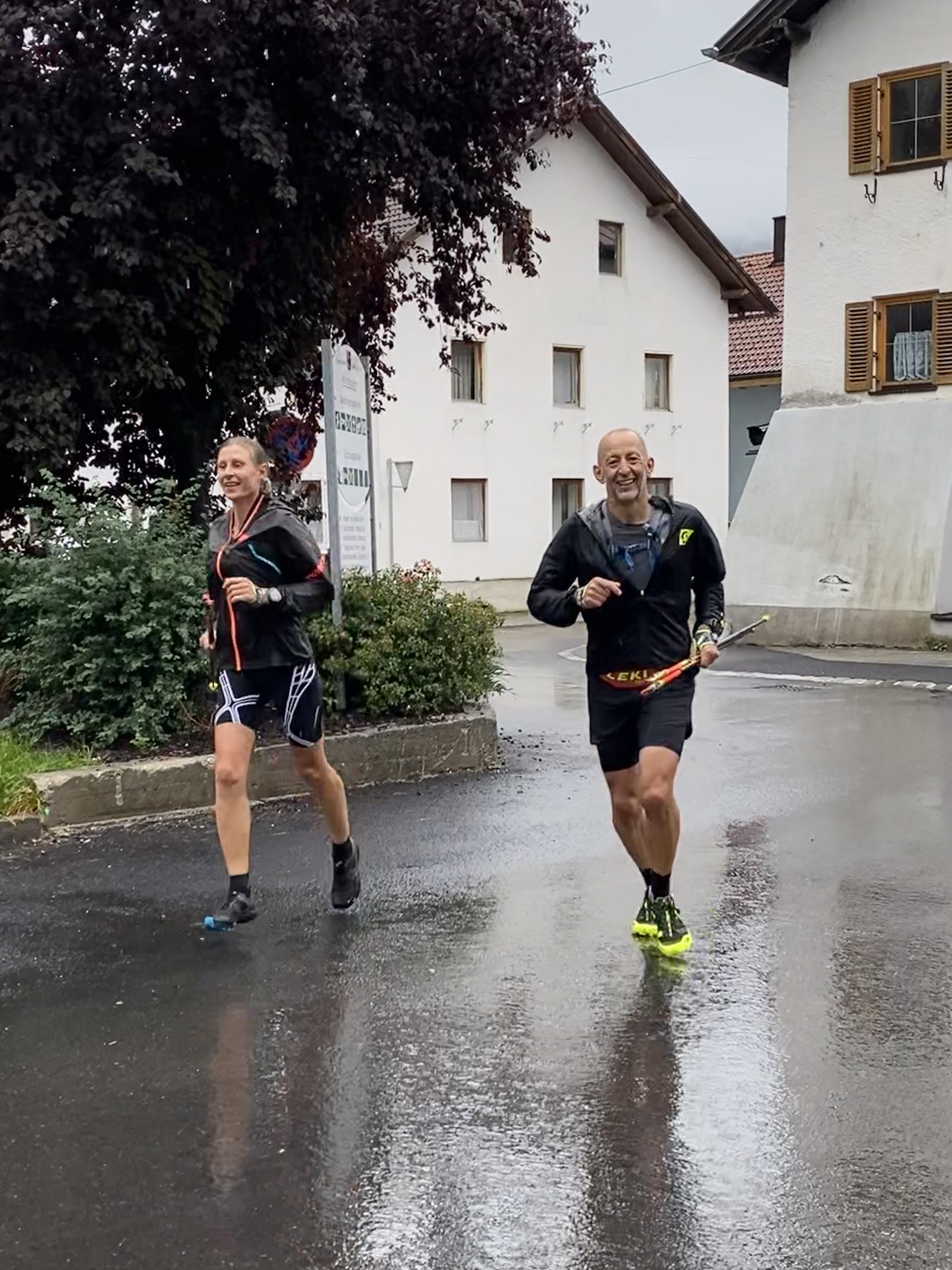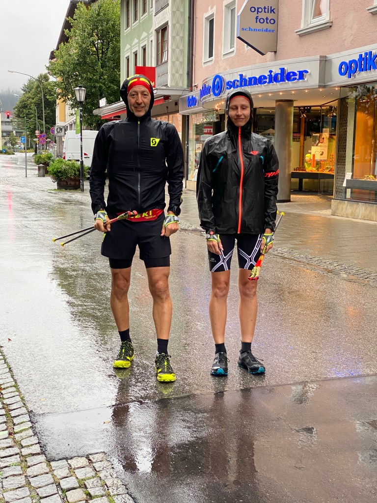So waren wir dann unterwegs. Einige Streckenabschnitte und Erlebnisse von vor zwei Jahren waren uns tatsächlich noch präsent, bei anderen Streckenabschnitten konnten wir uns wiederum überhaupt nicht daran erinnern, hier jemals gewesen zu sein. Wir konnten uns mangels Aussicht auf`s Wesentliche fokussieren. Laufen und Pfützen springen. Selbst bei grausigster Wetterprognose und der Gewissheit, dass Schuhe und Füße in jedem Fall patschnass werden, hüpft man intuitiv im „Storch im Salat Style“ um die Pfützen herum. Einlaufen konnten wir uns die ersten 6 km ab Garmisch, ganz flach und entspannt, den ersten Toilettenstopp inkludiert. Nach und nach mischten sich die Höhenmeter darunter und auch die geliebte Skipiste – erst hoch, dann runter – ließ nicht allzu lange auf sich warten. Perplex nutzten wir ein regenfreies Fenster von 20 Minuten, um mal ohne Regenjacke unterwegs zu sein. Fazit: ohne das Geraschel der Kapuze kann man sich viel besser unterhalten. Den langen Anstieg nach Biberwier hatten wir länger und steiler in Erinnerung, aber die positive Überraschung, als wir „schon“ oben waren, haben wir gerne mitgenommen. Die Aussicht auf den Fernsteinsee war identisch zu der vor zwei Jahren: eine graue Wand. No isch halt so.