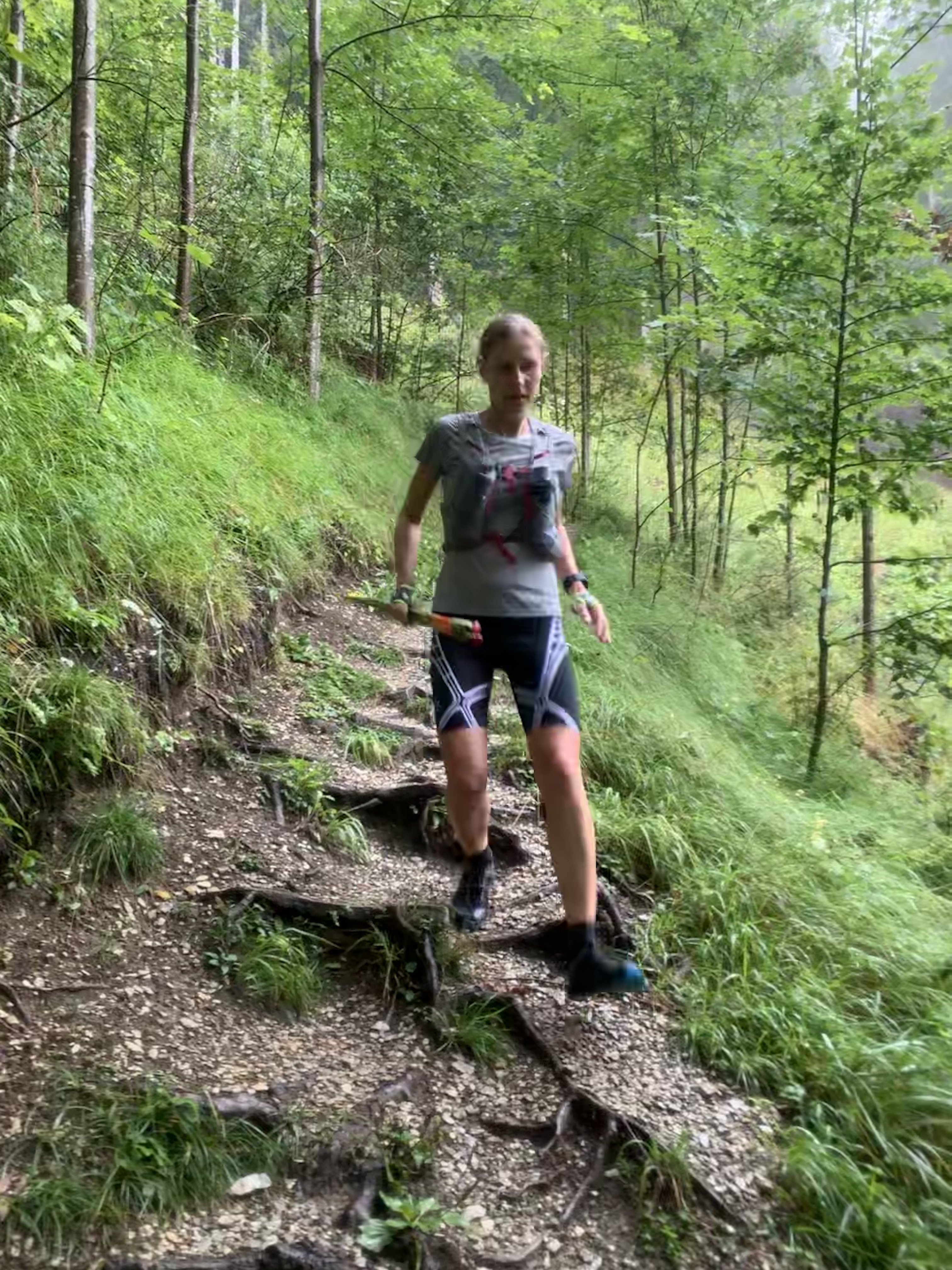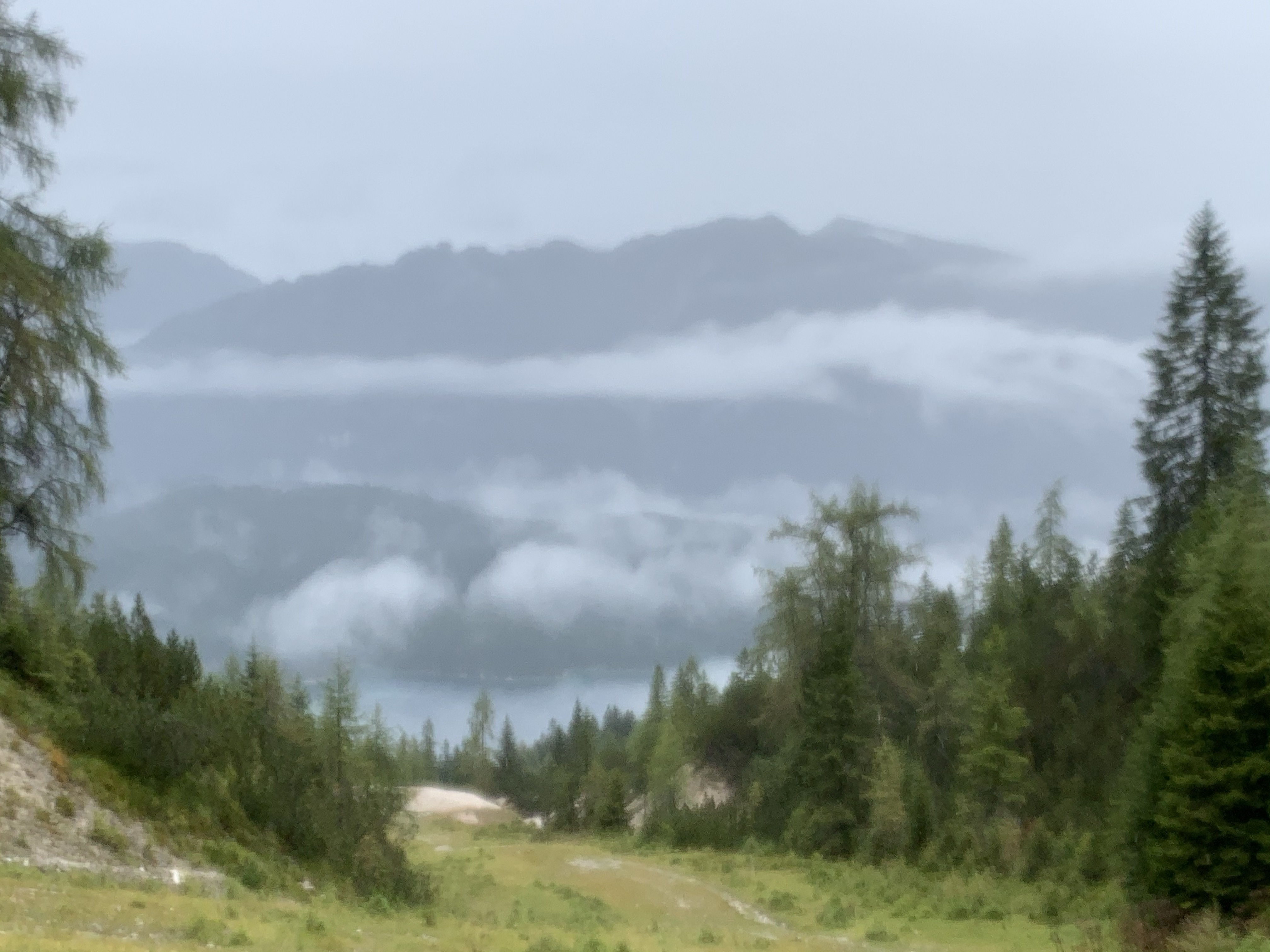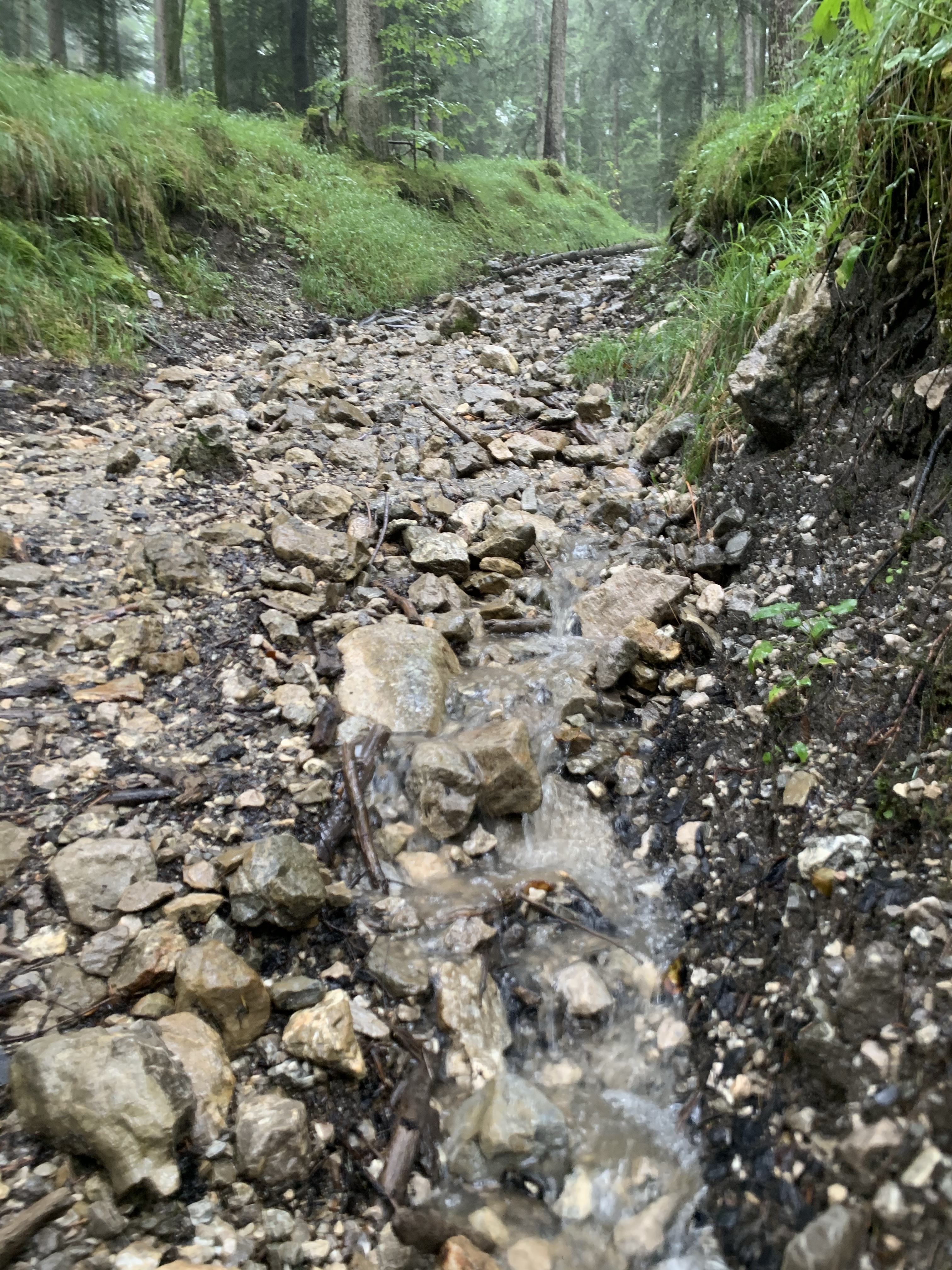 So waren wir dann unterwegs. Einige Streckenabschnitte und Erlebnisse von vor zwei Jahren waren uns tatsächlich noch präsent, bei anderen Streckenabschnitten konnten wir uns wiederum überhaupt nicht daran erinnern, hier jemals gewesen zu sein. Wir konnten uns mangels Aussicht auf`s Wesentliche fokussieren. Laufen und Pfützen springen. Selbst bei grausigster Wetterprognose und der Gewissheit, dass Schuhe und Füße in jedem Fall patschnass werden, hüpft man intuitiv im „Storch im Salat Style“ um die Pfützen herum. Einlaufen konnten wir uns die ersten 6 km ab Garmisch, ganz flach und entspannt, den ersten Toilettenstopp inkludiert. Nach und nach mischten sich die Höhenmeter darunter und auch die geliebte Skipiste – erst hoch, dann runter – ließ nicht allzu lange auf sich warten. Perplex nutzten wir ein regenfreies Fenster von 20 Minuten, um mal ohne Regenjacke unterwegs zu sein. Fazit: ohne das Geraschel der Kapuze kann man sich viel besser unterhalten. Den langen Anstieg nach Biberwier hatten wir länger und steiler in Erinnerung, aber die positive Überraschung, als wir „schon“ oben waren, haben wir gerne mitgenommen. Die Aussicht auf den Fernsteinsee war identisch zu der vor zwei Jahren: eine graue Wand. No isch halt so.