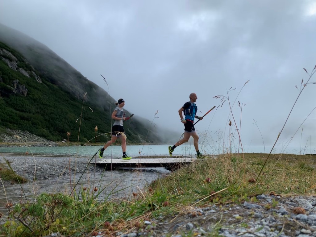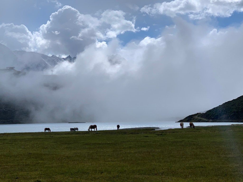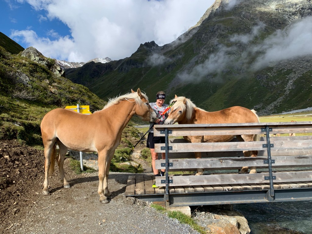 Kkkkkalt war es am Start heute morgen auf knapp 1.600 m. Eingepackt mit Armlingen und Stirnband nahmen wir die 3 km Anlauf zum Rifflseeanstieg, die wir in der 3. Etappe abgekürzt hatten. Die Eiseskälte war schon zu Beginn des Anstiegs verflogen. Das 700 hm en bloc Aufwärmprogramm zum Rifflsee tat hier gute Dienste. Und welche Überraschung oben am See: Sonne! Die Ecke haben wir auch vom Pitz Alpine Glacier Trail schätzen und lieben gelernt und so konnten wir quasi noch kurz „nach dem Rechten sehen“ auf der Runde um den See. Frei laufende Pferde benötigten etwas gutes Zureden, bevor sie uns den Weg über die Brücke gewährten. Den anschließenden Downhill ins Tal hatten wir als schön flowig in Erinnerund und genau so war es auch. Inzwischen auch vollkommen aufgeklart, hatten wir freie Sicht auf den Anstieg der gestrigen Wandertour und die umliegenden, noch schneebedeckten Gipfel.