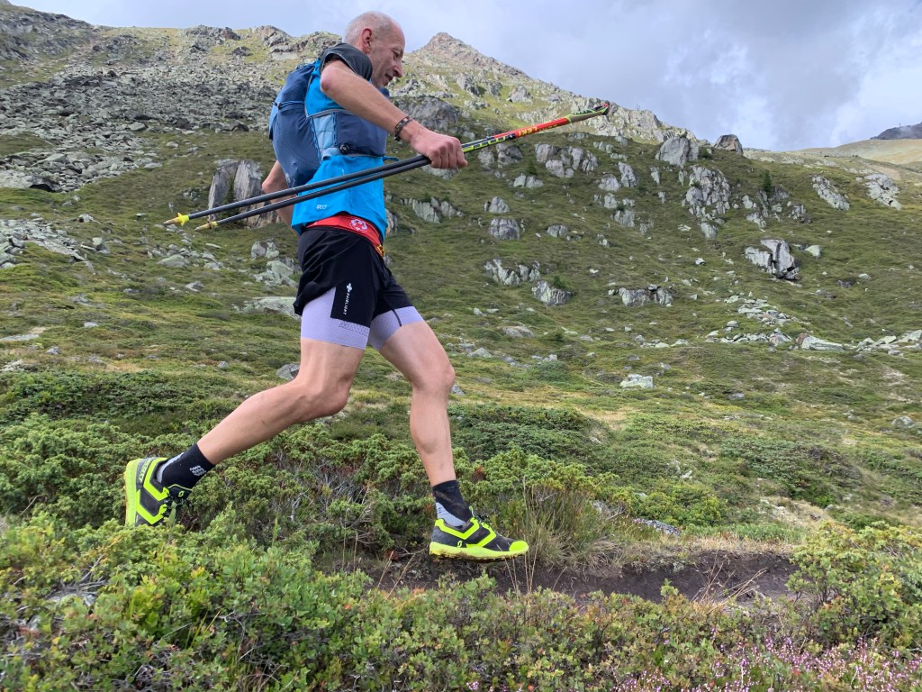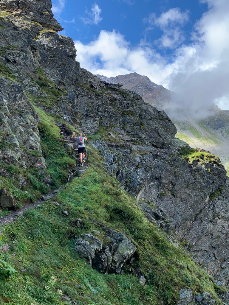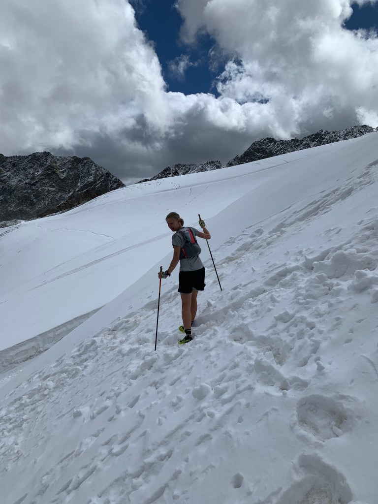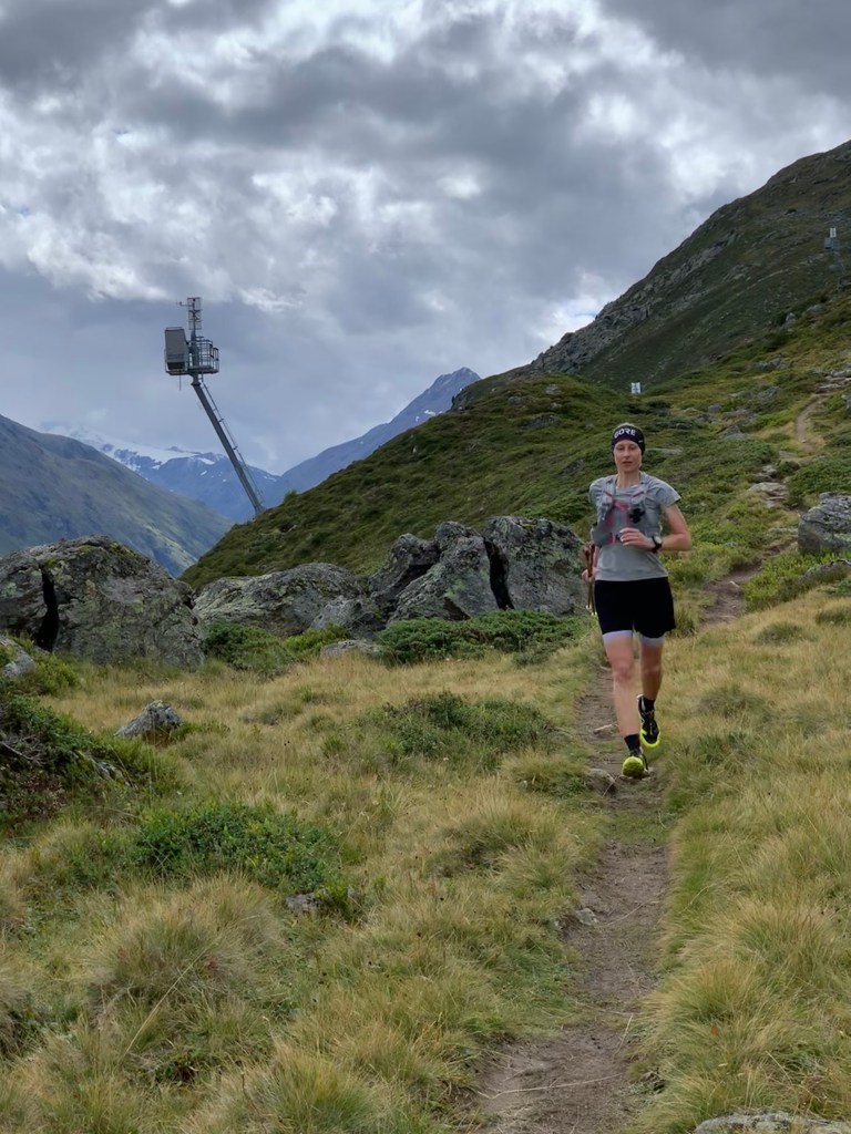 An der Talstation der Gletscherbahn verließen wir dann die Originalstrecke von 2018 (wir hatten wenig Lust, noch eine Skipiste hoch zu laufen und anschließend viel Skipiste runter zu laufen) und der Weg führte uns durch den Rosi-Mittermaier-Tunnel rüber zum Tiefenbachgletscher. Die Strecke mag mit Skibus etc. wenig präsent sein, aber die 2 km durch den kalten, dunklen und ansteigenden Tunnel waren schon ein wenig mystisch. Dafür wurden wir belohnt mir einem 9 km Trail bis runter nach Sölden. Ganz offiziell war das ein schwarzer Mountainbike-Trail, die spinnen doch, die Biker. Wir waren froh, dass wir nur laufen mussten;-). Aber auch laufender Weise haben 1.500 hm im Downhill am Stück dann wirklich gereicht.