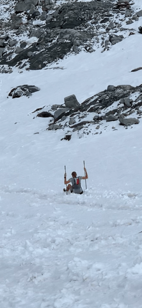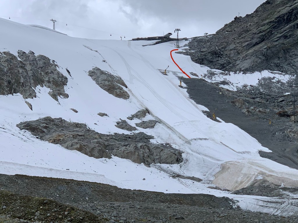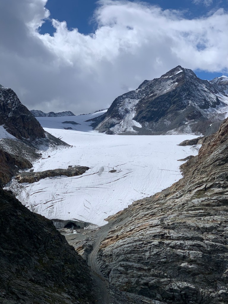 War beim TAR 2018 der Weg auf den Rettenbachgletscher gut präperiert und auch ein Seil zu Hilfe angebracht, hangelten wir uns heute dem grumpeligen Wanderweg entlang, landeten dann aber doch an einer etwas steileren Stelle auf dem Gletscher. Allen Bemühungen zum Trotz landeten wir schließlich auf dem Hosenboden und nahmen sitzender Weise Fahrt auf dem Downhill auf. Nur so viel: langsam war es nicht, aber echt kalt…..
