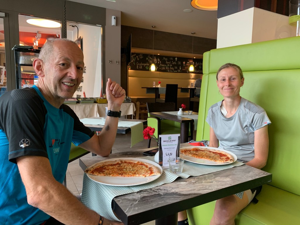 Sandra hatte uns per WhatsApp schon informiert, dass es im Ziel mit einer Pizza klappen wird. Und ja, wir freuten uns den gesamten Downhill schon drauf. Lecker war das!