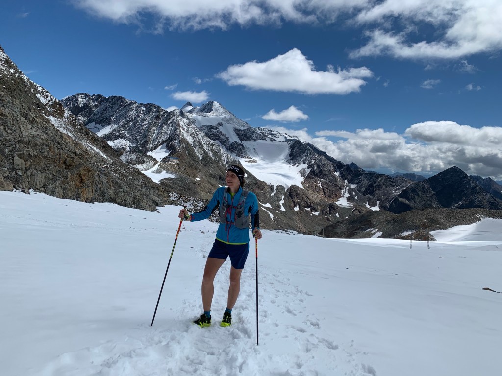 Ab km 8 sollte es dann steil bergauf gehen, was uns veranlasste, uns noch mit einem Espresso Gel zu stärken. Mit zunehmender Höhe wurde es trotz strahlendem Sonnenschein etwas kühler, so dass die Hände mit der Zeit doch etwas klamm wurden. Als wir rund 3/4 des Anstiegs geschafft hatten, präsentierte sich die Hildesheimer Hütte auf einer exponierten Lage, was uns sehr beeindruckte. Kurzentschlossen wärmten wir uns in der Hütte am wärmenden Ofen und mit einer heißen Suppe auf, bevor wir uns zum letzten Anstieg über den Gletscher aufmachten.