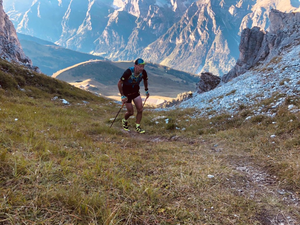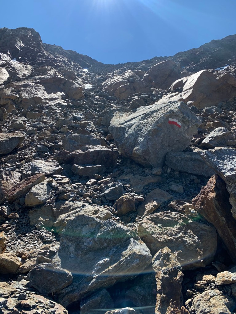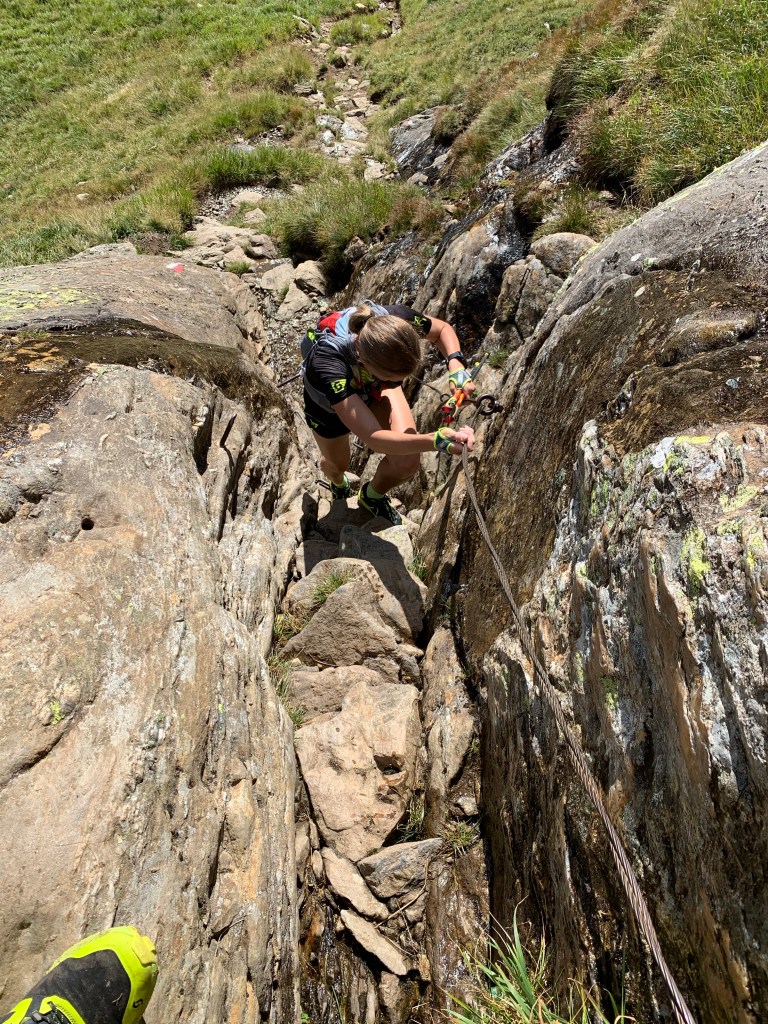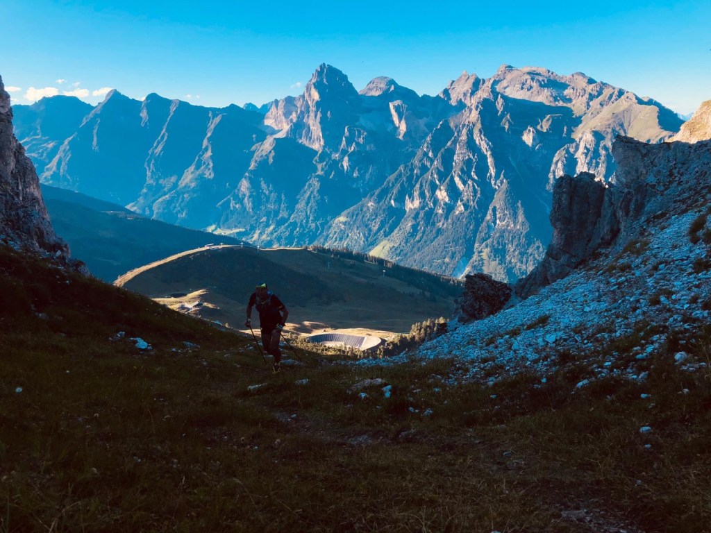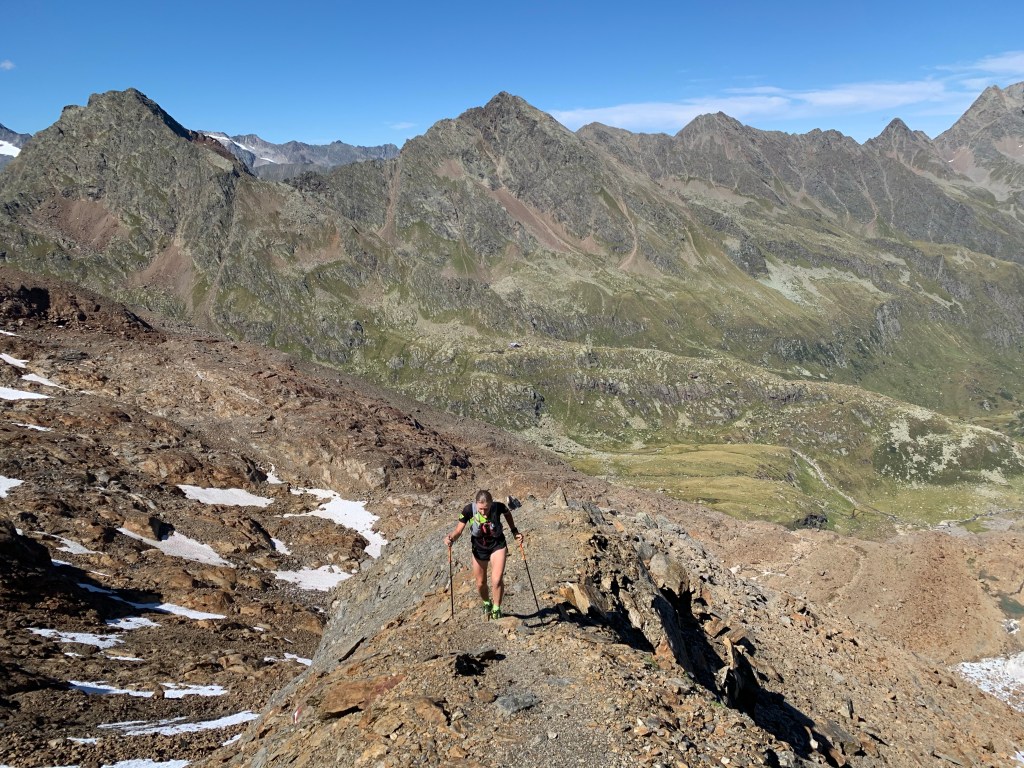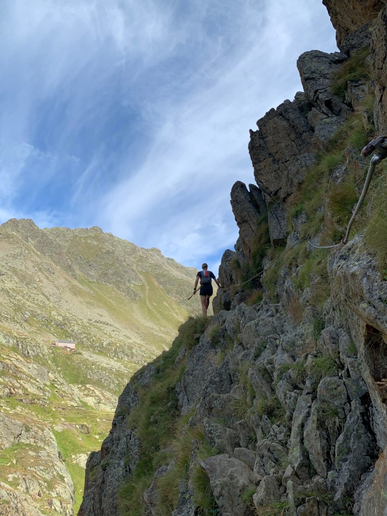 Der Übergang zur Magdeburger Hütte gestaltete sich sehr steil, sowohl im Aufstieg als auch auf der anderen Seite im Abstieg. Obwohl wir den Übergang in 1:40 h zeitlich gut bewältigten, war auch hier so gut wie kein Laufanteil dabei. Im Downhill von der Magdeburger Hütte fühlten wir uns sehr an den Prügelweg im Rosengarten erinnert (für diejenigen, die das kennen). Die Freude über die Wegbeschaffenheit hielt sich in Grenzen.