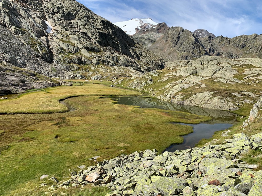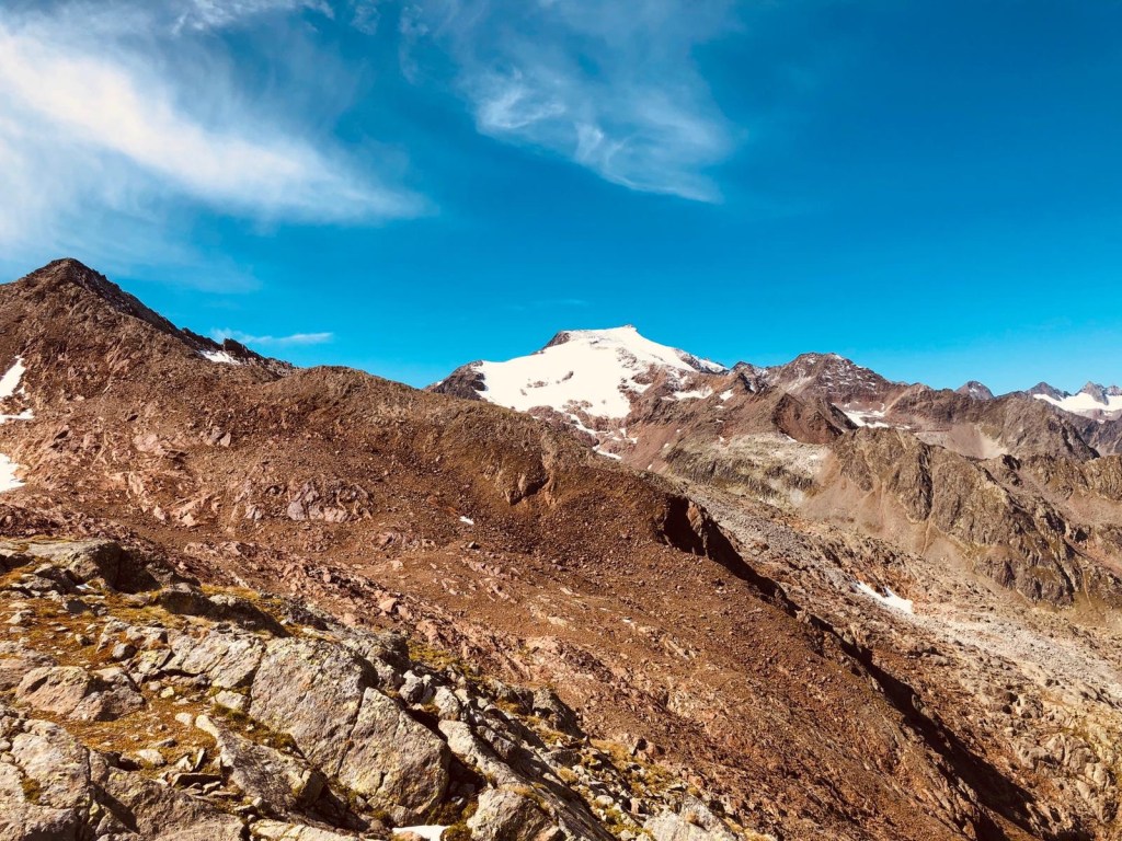 Von einer Hüttentrekking-Tour auf dem Stubaier Höhenweg Ende Juli kannten wir das erste Viertel der Strecke und wussten schon, dass hier fast nichts wirklich laufbar sein wird. Vom Tal aus noch bei angenehmer Morgenfrische stiegen wir zur Nürnberger Hütte auf, von wo aus wir über das Paradies (heißt wirklich so – und ist sehr empfehlenswert) und das Simmingjöchl nach den ersten 1.400 hm im Anstieg weiter gingen zur Bremer Hütte. Dort wurden wir wie auch auf der Wandertour von den Hüttenwirten Christian und Stephanie herzlich willkommen geheißen. Backerbsensuppe und Cola sollte damit die Hauptmahlzeit für heute darstellen. In der Zeit lagen wir den technisch anspruchsvollen Verhältnissen entsprechend gut, absolviert hatten wir aber eben erst gut 11 km.